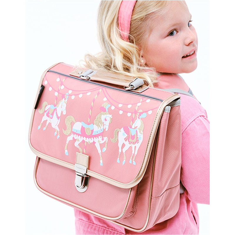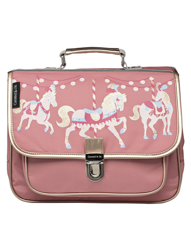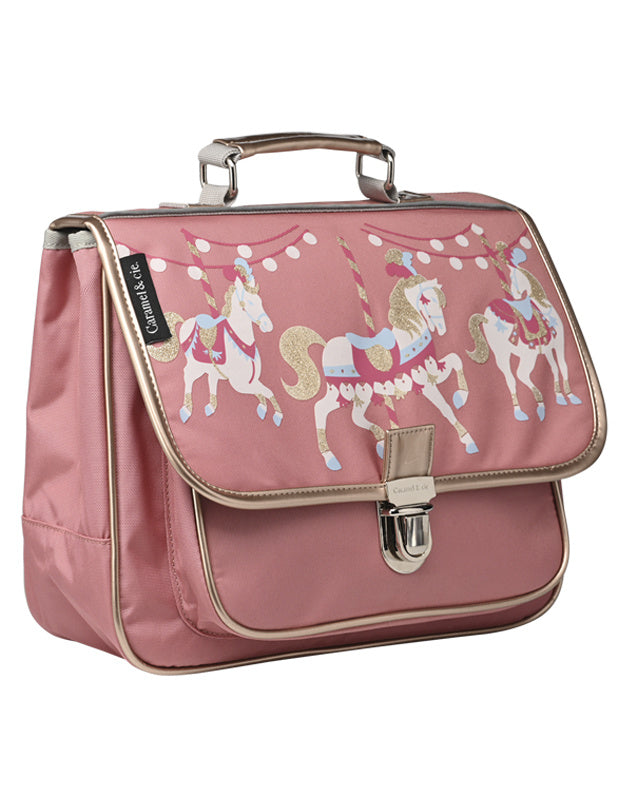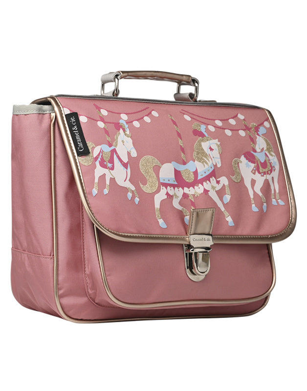 Stap in de magische carrousel van schoolplezier met deze roze pompende paarden mini schooltas.