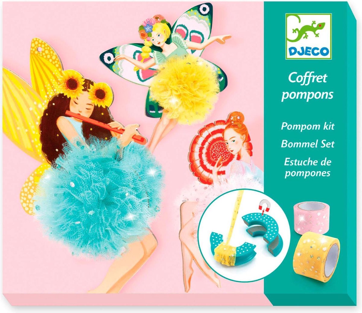 Ontdek magie en creativiteit met Djeco's Pompon Feeën DIY Set. Creëer schattige pompons met magnetische schijfjes en ontwerp betoverende sprookjesjurken voor jouw feeën.