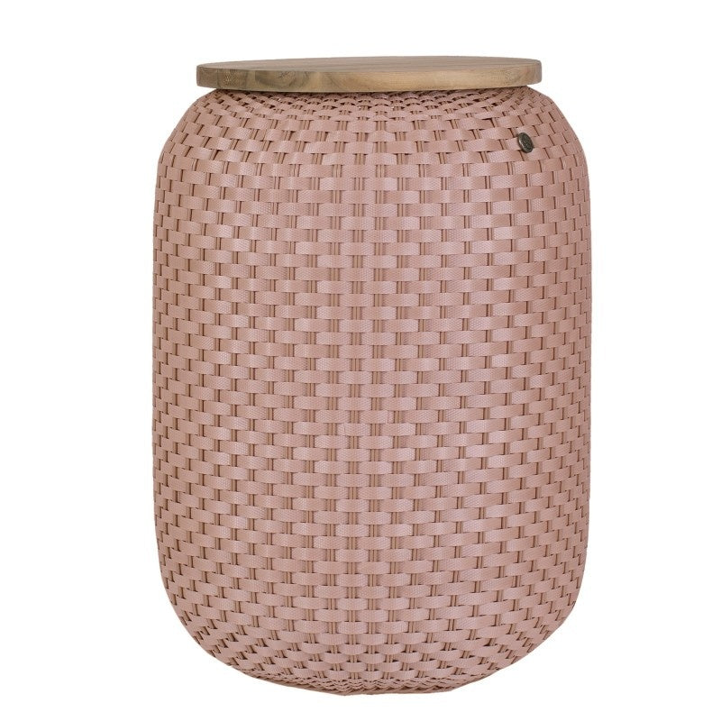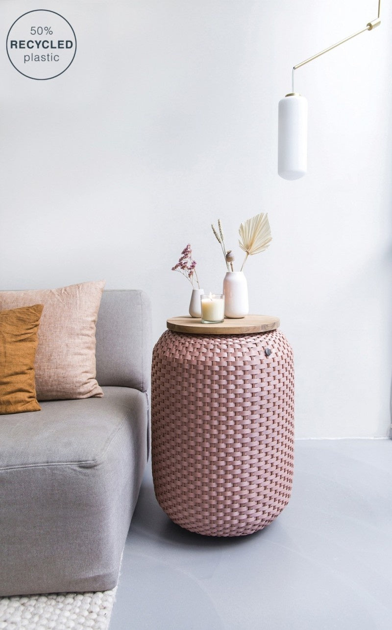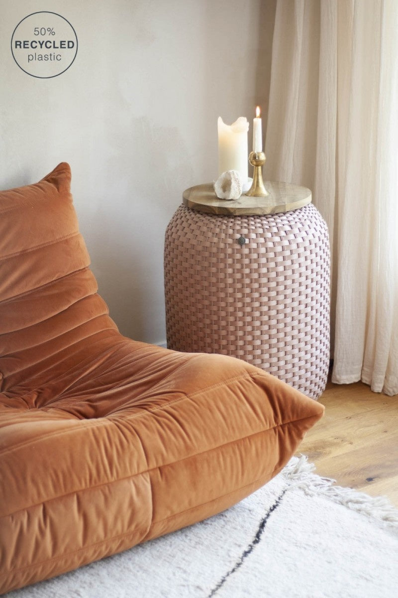 Een prachtige handgevlochten bijzettafel met een geheim: ontdek de handige opbergruimte onder het warme houten blad. Een must-have voor een sfeervol interieur dat perfectie en functionaliteit combineert.