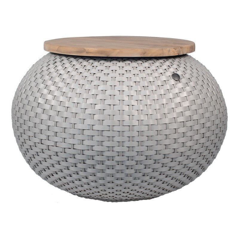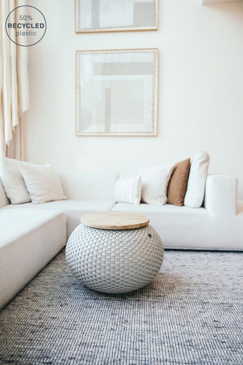 Ontdek de veelzijdige Halo: een opbergtafel, sidetable en poef in één uniek en handgeweven design. Verborgen opbergruimte en een prachtige acaciahouten plaat maken dit item een must-have voor elk speels interieur.