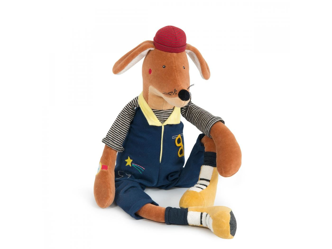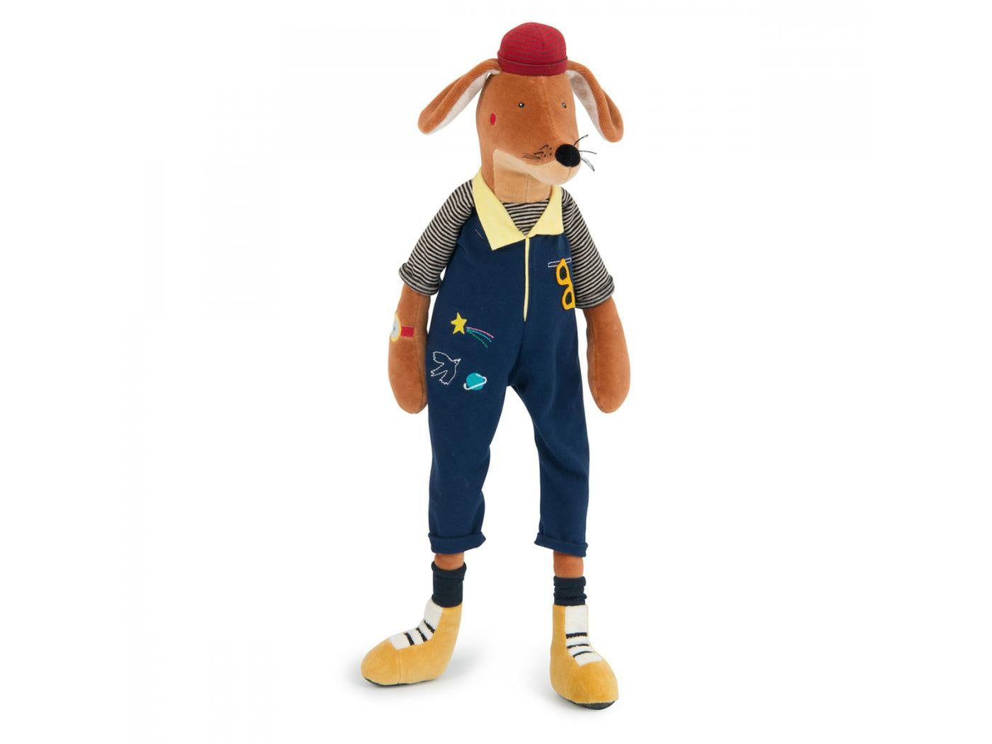 Elvis de hond ziet er geweldig uit in zijn nonchalante tuinbroek en gestreepte hoed terwijl hij op weg is naar zijn tekenles. Hij is de ultieme coole metgezel uit de jaren 90 die zowel jong als oud zal aanspreken. Of het nu is om mee te spelen of als stijlvolle decoratie, Elvis brengt een dosis plezier en charme in huis.